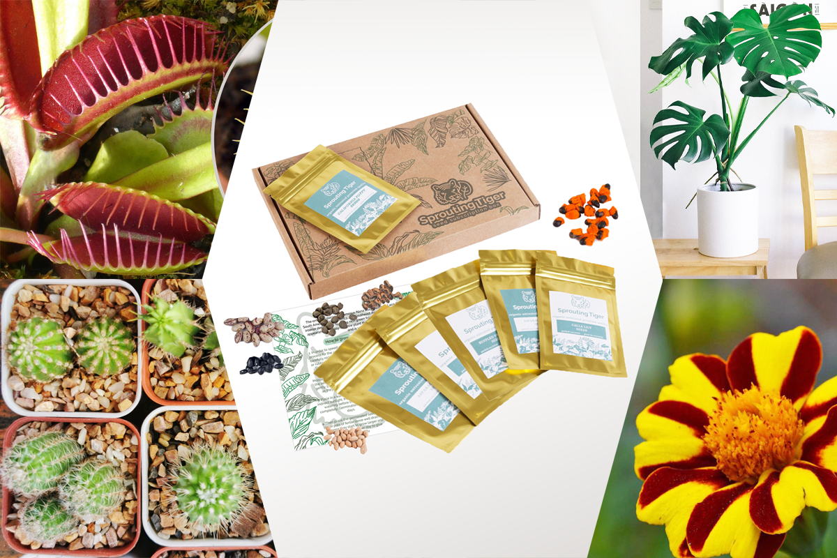 A range of 5 seed varieties which may include Venus Fly Trap, an edible flower, Monstera cheese plant, Cactus and Giant Teddy Bear Sunflowers