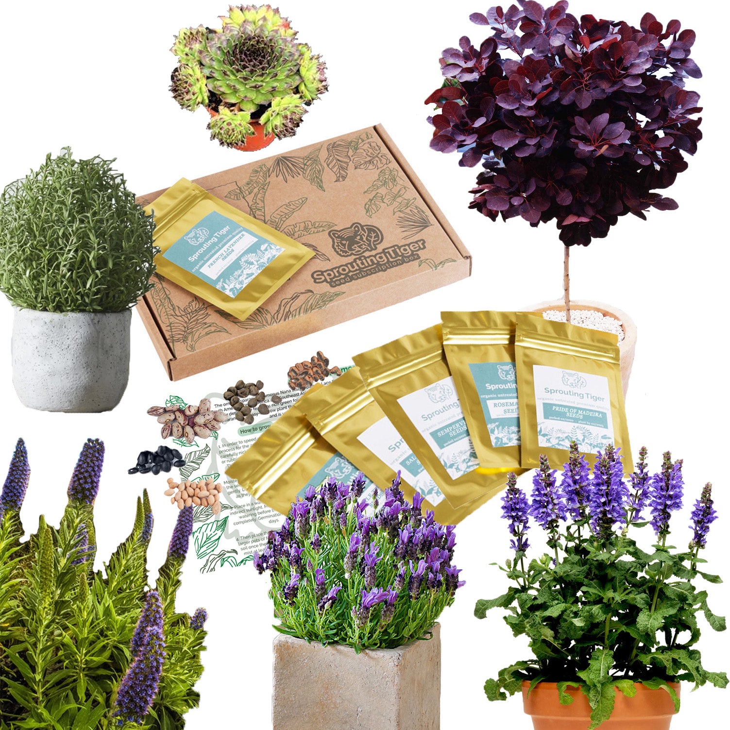 Examples of seeds included are as follows: French Lavender, Rosemary, Pride of Madeira, Sempervivum, Cotinus Coggygria & Salvia say so blue.