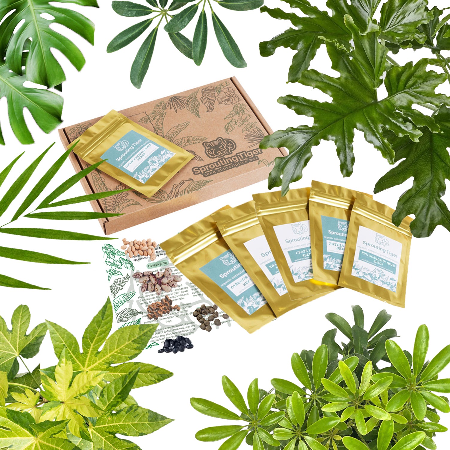 Examples of seeds included are as follows: Monstera Deliciosa, Grape Ivy, Umbrella Tree, Pygmy Date, Japanese Aralia (Paperplant) and Philodendron Hope.